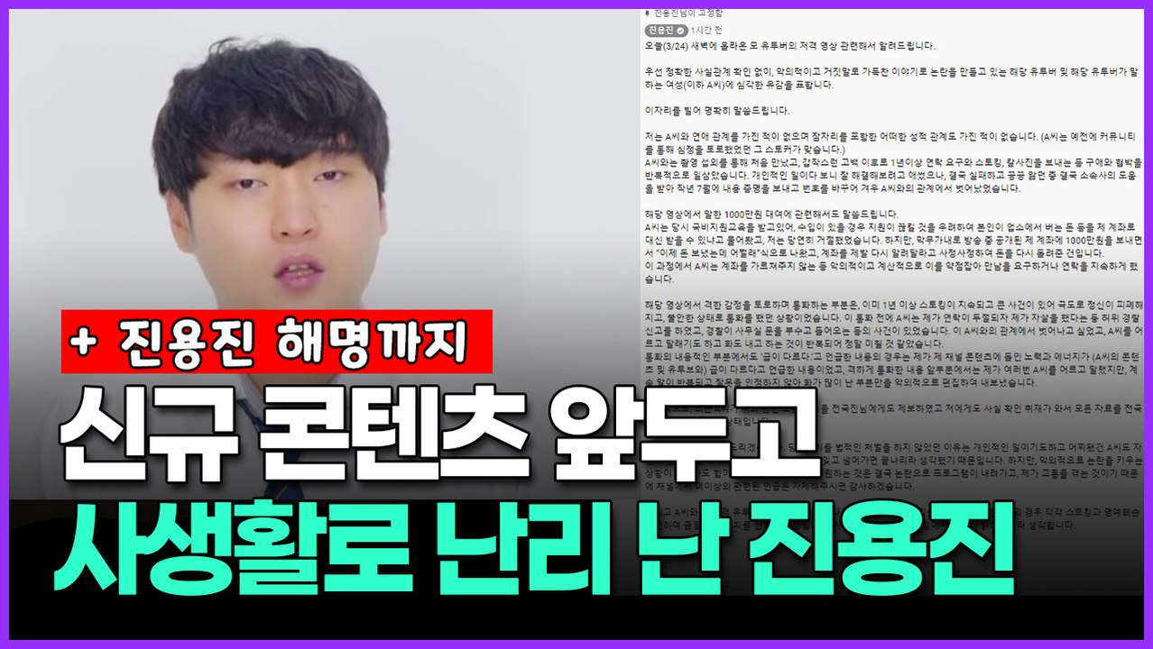 200만 구독자를 보유한 유명 유튜버 진용진 오늘 새벽 그가 자신의 유튜브 채널에서 하나의 댓글을 통해 공식 해명을 했습니다. 이 갤러리가 연관 갤러리로 추가한 갤러리. 페미니스트 래퍼에게 이런 댓글 남긴 진용진. 진용진 과거 사생활 논란 총정리 요약. Ladin 1 분 전 350.